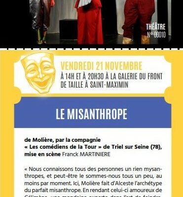 Le Misanthrope au Festival Sud’Oise sur Scène Quand 21 novembre 2025 20h30 - 22h15 Ajouter au Calendrier Télécharger ICS Calendrier Google iCalendar Office 365 Outlook Live Où Galerie du front de Taille Rue Jean Jaurès, Saint-Maximin, 60740 Type d’évènement Évènements des troupes Deux représentations le même jour. La première à 14h pour les scolaires et la seconde à 20h30 pour tout public