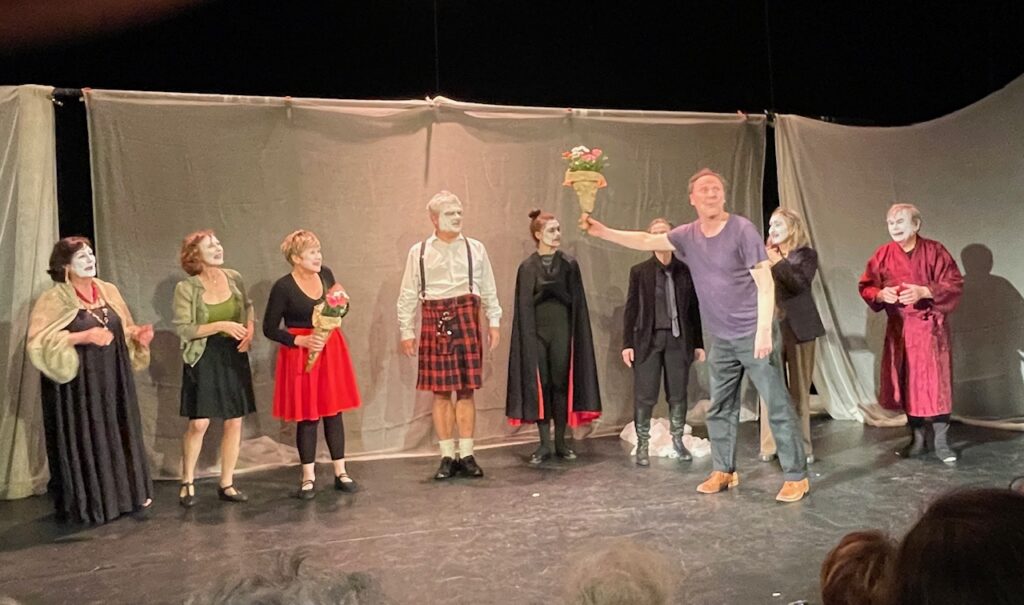 La fête s’est poursuivie avec un gâteau d’anniversaire et autour d’échanges conviviaux entre les troupes de théâtre Yvelinoises venues en nombre et avec le public extérieur. L’ambiance était très chaleureuse, et tout le monde a salué la qualité de la pièce et le jeu des comédiens.